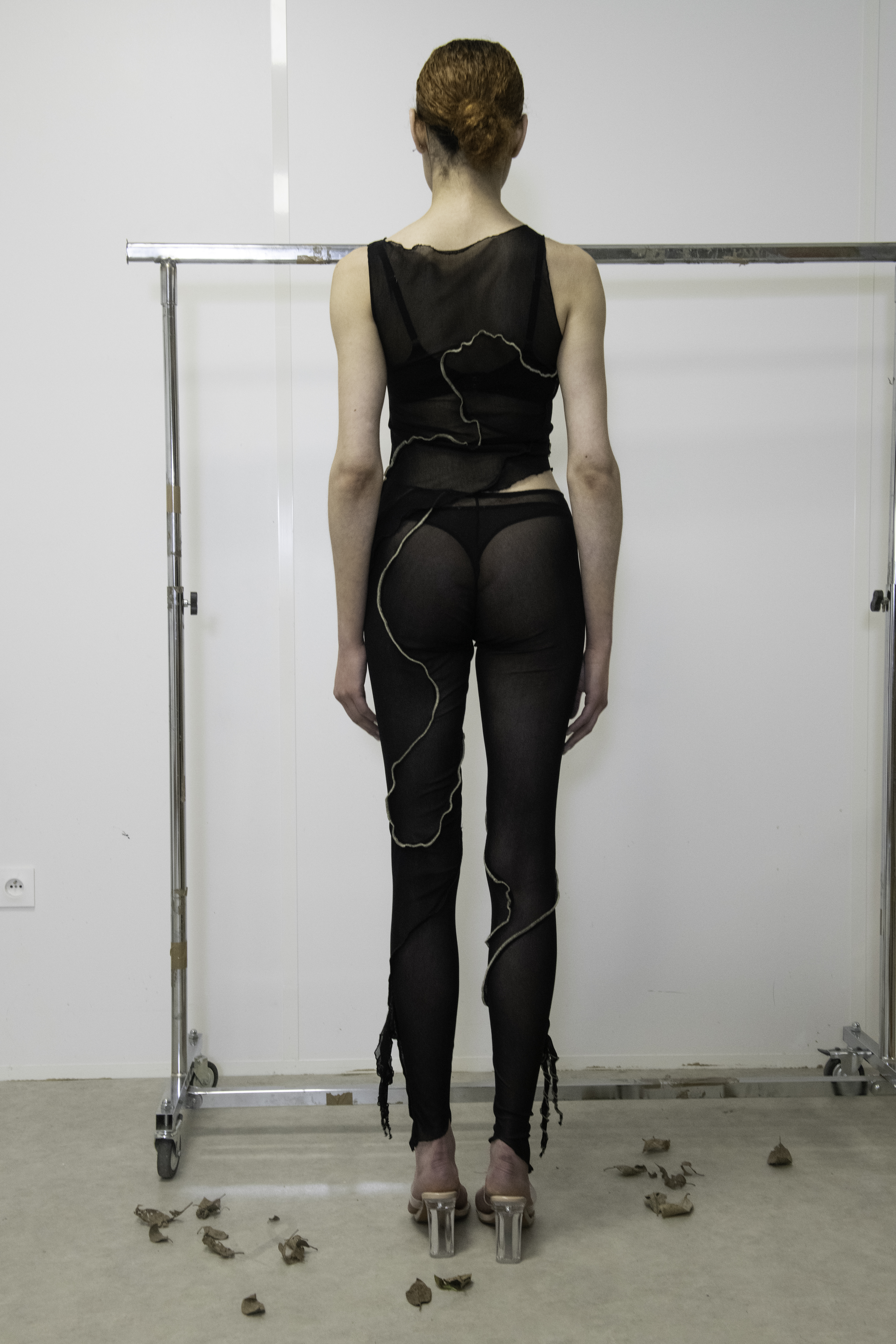 A DEAD LEAF ON AN OFFICE CHAIR is a limited edition capsule collection in which each garment is made of two different deadstock fabrics and patterns with organic forms. The earthy brown fabric evokes the fallen leaf, the transparent black recalls the office chair, and the grey recalls the concrete. The encounter between those different elements create sinuous lines which appear like off white traces, a mark running trough the body of the collection.