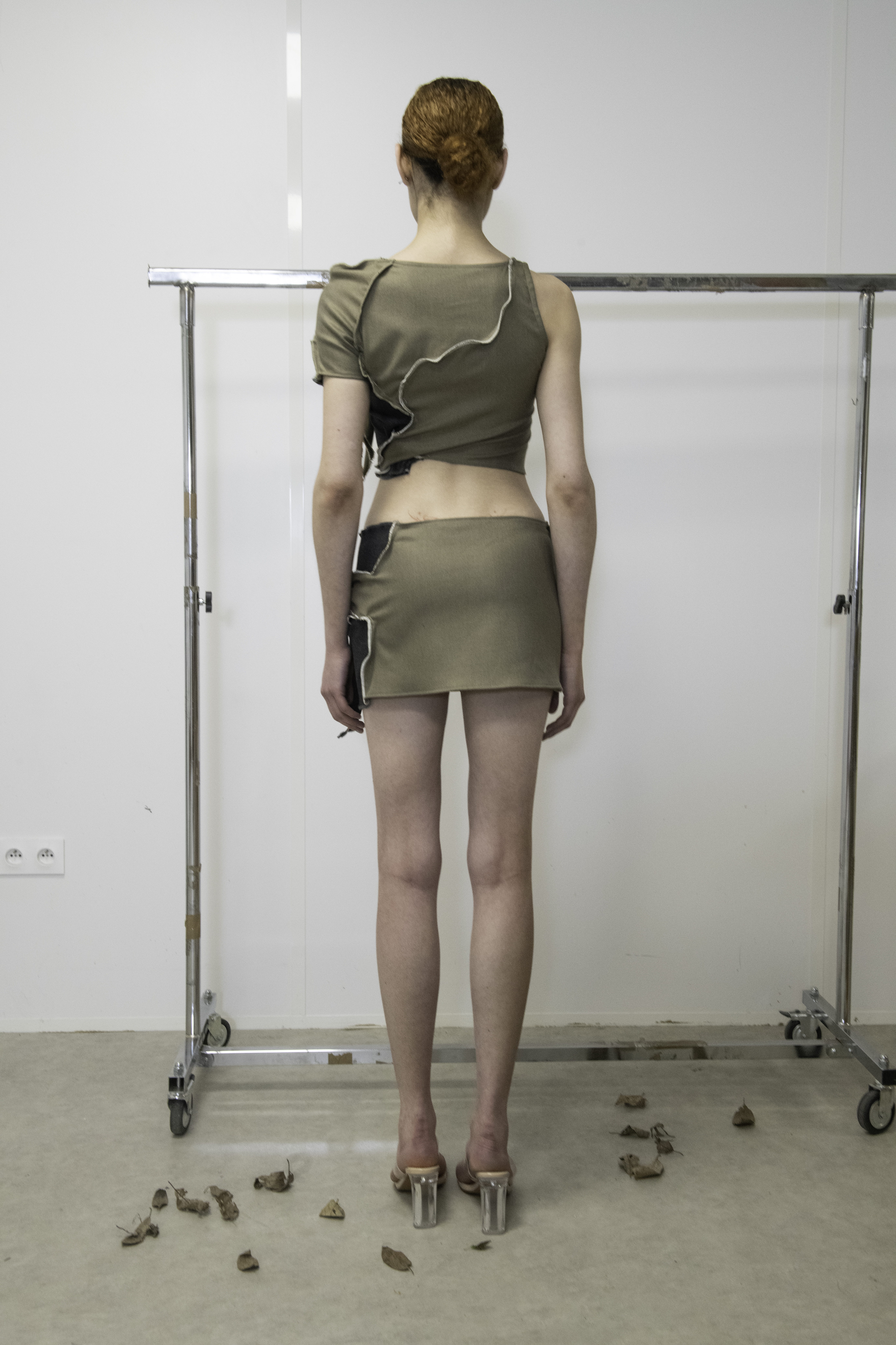 A DEAD LEAF ON AN OFFICE CHAIR is a limited edition capsule collection in which each garment is made of two different deadstock fabrics and patterns with organic forms. The earthy brown fabric evokes the fallen leaf, the transparent black recalls the office chair, and the grey recalls the concrete. The encounter between those different elements create sinuous lines which appear like off white traces, a mark running trough the body of the collection.