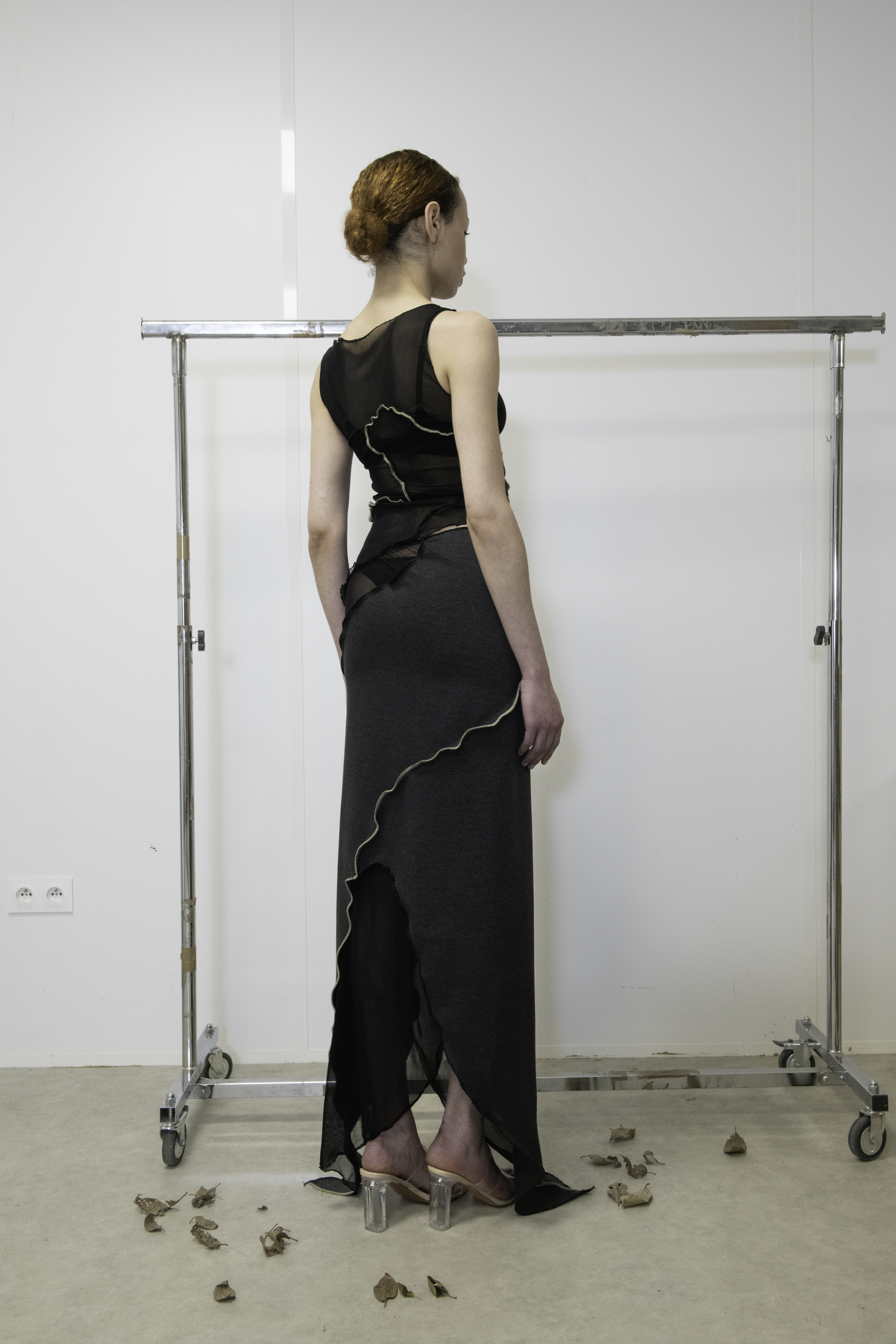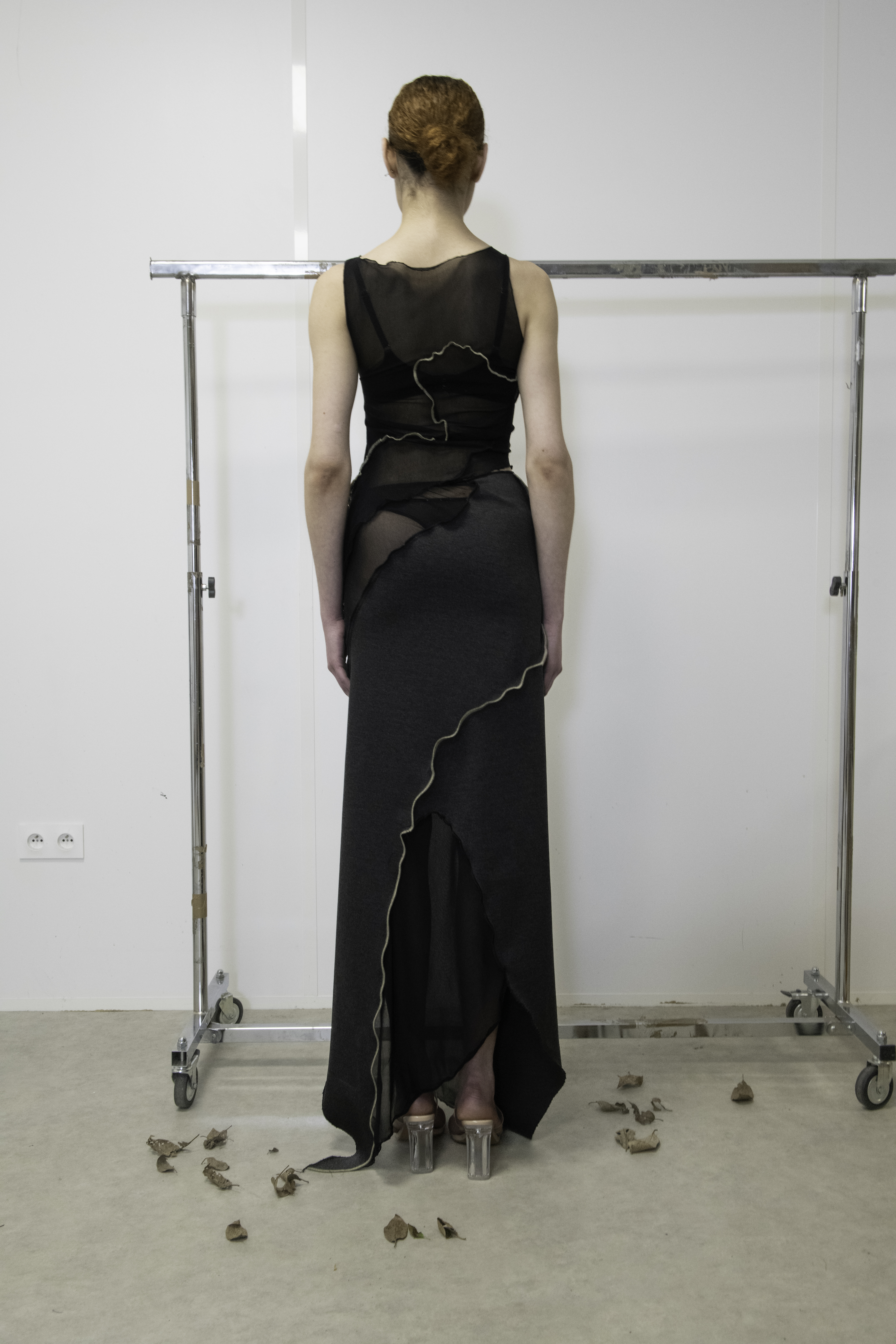 A DEAD LEAF ON AN OFFICE CHAIR is a limited edition capsule collection in which each garment is made of two different deadstock fabrics and patterns with organic forms. The earthy brown fabric evokes the fallen leaf, the transparent black recalls the office chair, and the grey recalls the concrete. The encounter between those different elements create sinuous lines which appear like off white traces, a mark running trough the body of the collection.